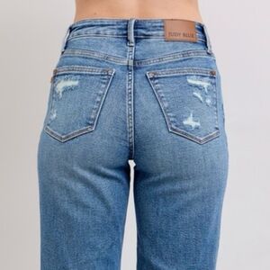 Judy Blue High-Rise Distressed Straight Leg Torn Hole Slim Fit Jeans Denim Pants