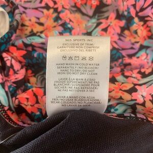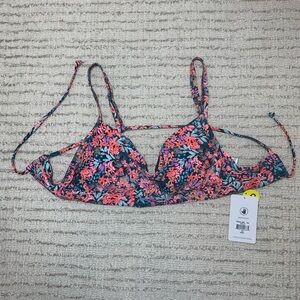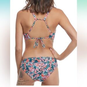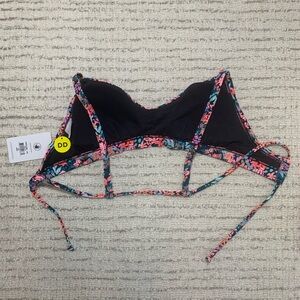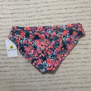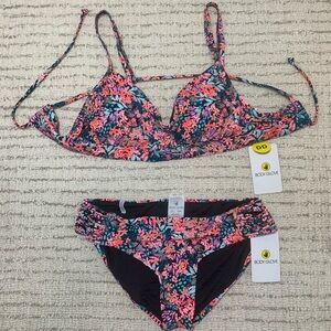 Body Glove brand bikini set (top and bottom included). New with tags including hygienic liner. Color is called Amy. Top is a triangle-style with adjustable straps and removable pads in size DD (style is called Drew). Bottoms are low rise with a cross looped detail on the hip in size M (style is called Ruby).