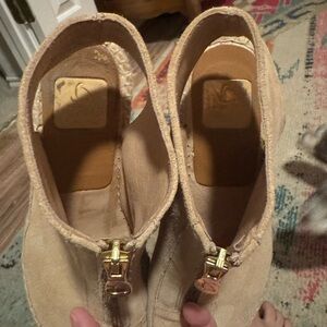 Gently used Kanna wedge sandals, suede tan upper and a comfortable wedge heel. The peep-toe design adds a touch of elegance, making them perfect for casual outings. Crafted with attention to detail, these shoes offer both versatility and sophistication. Made in Spain, these are super lightweight, comfortable and cushy. 3.25” wedge, 1.25” platform. Size 37. No box. Smoke free home, make me an offer!
