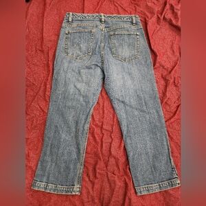 GAP boot cut capri jeans in a classic blue. Features a stylish button closure and belt loops.