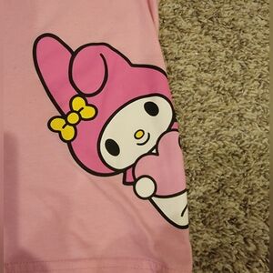 Adorable pink tee featuring Hello Kitty and friends. Bright and fun design. Gently used. Girls size Medium. Soft Cotton and Polyester blend. Made well by Sanrio. The shirt has short sleeves and a crew neck, and the design includes Hello Kitty, Keroppi, and My Melody. The text "Hello Kitty and Friends" is printed near the neckline. These characters are popular creations of the Japanese company Sanrio. Fun to wear. The back of the characters are on the back of the shirt too.