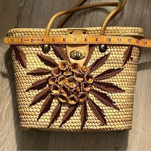 Straw Braided 60s 70s Vintage Woven Large Floral Appliqué Dual Handle Mid Century Modern Acapulco Yarn Starburst Square Flap Top with Turn Key Brass Gild Hardware Tote Bag