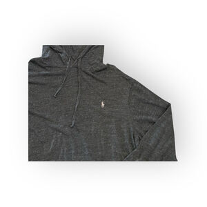 This is a pre-owned Polo Ralph Lauren hoodie in size 2XLT. The garment is Heather black and features long sleeves and a hood with drawstrings. The material is a soft, lightweight knit. The hoodie measures approximately 32.25 inches in length and 24 inches in width. A small Polo logo is embroidered on the chest. There are no visible stains or tears.