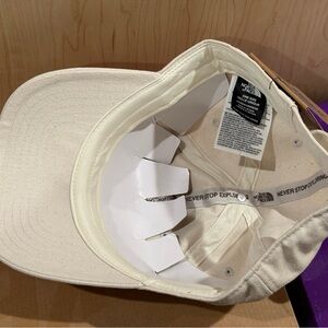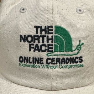 Cream colored cap by a collaboration between The North Face and Online Ceramics. Embroidered green logo and text.
