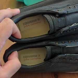 These Converse X John Varvatos sneakers boast an all-black leather-like construction, offering a sleek and minimalist design. The traditional lace-up style and reinforced toe cap ensure durability, while the vulcanized rubber sole provides comfort and a classic look. Perfect for casual outings, these sneakers offer a timeless appeal.