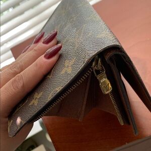 Elegant Louis Vuitton wallet. Iconic monogram design. Snap closure for security.