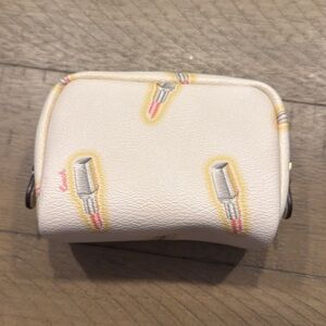 Stylish Coach pouch in cream with a fun lipstick pattern. Ideal for storing essentials. 100% authentic. Small pouch. 4.75 inches long, 3.75 inches in height, & 2 inches in depth. Never used, in perfect condition.