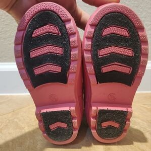 This pair of boots are a Toddler Size 7/8, and have been gently used. They show very little wear since they were only used on an occasional basis for jumping in puddles. The pattern is adorable and will leave you hoping for a rainy day so your little one can have the chance to wear them!