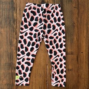 Chic Nike outfit with a gray tee featuring a logo. Pink leggings with a striking pattern. 068