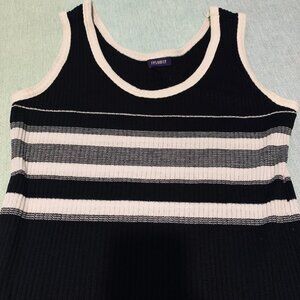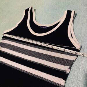 Authentic mid-90s sleeveless midi/maxi dress from cult-favorite brand 🖤 resource 🖤. Ribbed stretch knit in classic black with white and heathered gray horizontal stripes across the chest for a bold contrast. Body-skimming silhouette with lots of stretch. Scoop neck. No tags inside but fits like a small/med (see measurements!).