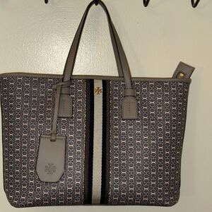 Preowned, Tory burch pvc tote bag, good condition, working zipper, middle design is cloth, smoke free home, adjustable/removable strap, measurements are approx. LxWxH 14x5x9.5, not including strap drop