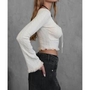 Introducing the Marilyn Lace Trim Knit Top by TIC TOC, a statement piece in a soft beige hue perfect for your boho chic collection. This top features long bell sleeves, a playful cropped silhouette, and a scoop neckline with a ruched tie for added flair. Crafted from a blend of 87% Rayon, 11% Polyester, and 2% Spandex, it showcases a delicate lace trim at the hem for a feminine touch. Closure: Pull-on. Designed in the USA, this top is your go-to for both style and comfort.