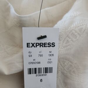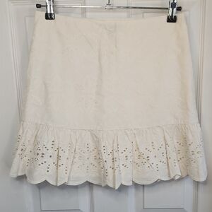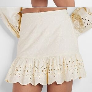 This charming cream mini skirt from Express is designed in a fit and flare style, perfect for casual or resort wear. It features a ruffled hem that adds a playful touch, while the high-waisted design ensures a flattering fit. The light fabric and elegant detailing make it a versatile addition to any wardrobe.