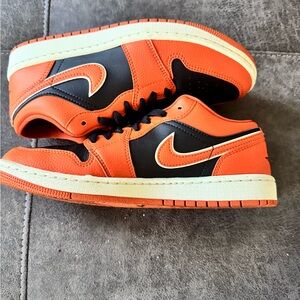 Stylish Jordan athletic shoes. Black upper with vibrant orange accents. Comfortable and durable design.