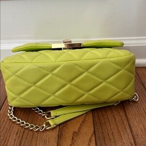 This used elegant bag which can be used as a shorter or longer strap shoulder bag by Kate Spade features a luxurious quilted design in the refreshing Lime Slushy color hue. The structured shape and gold-toned chain strap add a touch of sophistication, making it an ideal accessory for any stylish outing. Its smooth finish complements the geometric quilting, offering a perfect blend of style and functionality. It does have some denim transfer as noted in the photos.