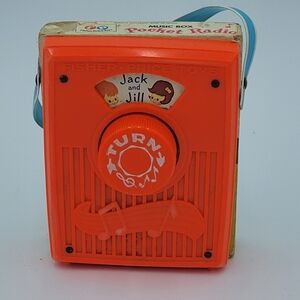 Classic Fisher Price pocket radio in vibrant orange. Features playful Jack and Jill design.