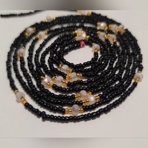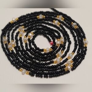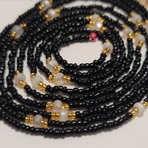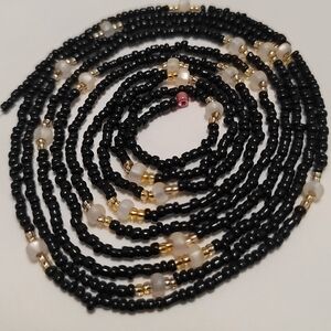 hand crafted Pure Elegance waistbeads showcase a harmonious blend of glossy black and shimmering gold beads, with frosted white glass beads creating a timeless piece.