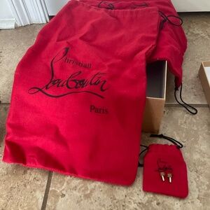 Pumps come in box with red Louboutin shoe bags and small bag containing extra heel taps