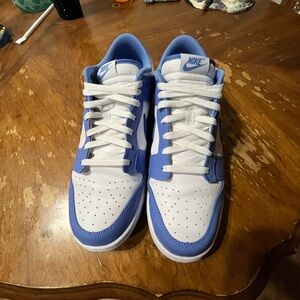 Classic white sneakers with navy accents. Features Nike logo. Comfortable and stylish.