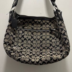 This Brighton shoulder bag showcases a sleek black and brown color palette, enhanced by decorative stripes for a touch of elegance. Its structured design ensures durability and style, making it a versatile accessory for any occasion.