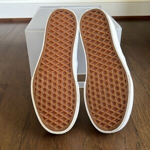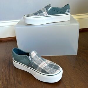 These suede upper slip-on one inch platform sneakers feature a double-stitched toe cap, vulcanized construction and Vans signature rubber waffle outsole. Low-top style with a plaid pattern, smooth lining, and cushioning insole.