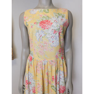 This is a vintage pre-owned Laura Ashley dress, made in Great Britain. The dress features a yellow floral pattern with pink and white flowers. It has a fitted bodice and a gathered skirt. The dress is made of 100% cotton. It has a button closure on the side. There are no visible stains or tears, but the fabric shows slight signs of wear consistent with pre-owned condition.