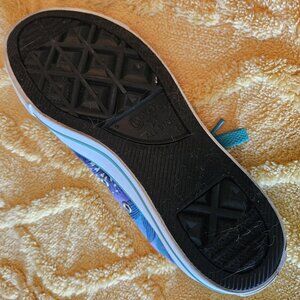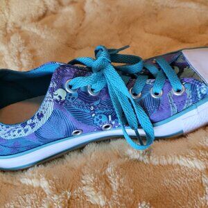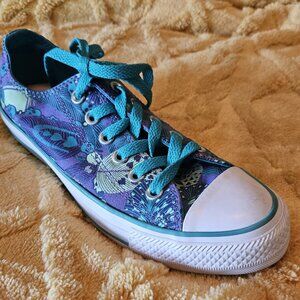 Women's turquoise blue and purple tropical skull All Star Chuck Taylor Converse low top canvas sneakers, Women's size 7, men's size 5. Great overall condition, minimal wear.