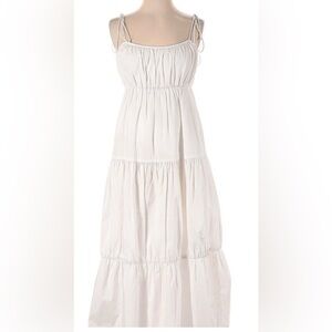 Golden accent piece is a little scratched if looked at closely. Other than that, dress is in beautiful condition. Working zippers, no holes or stains