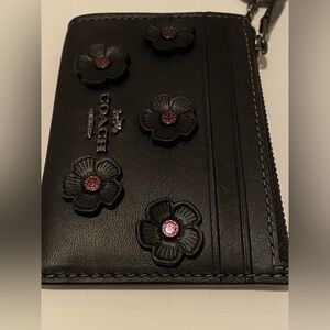 NWT Coach Mini Skinny ID Case | Black Leather | Gun Metal | Floral Appliqué