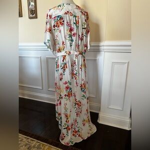 White, Multi Color Floral Long Cardigan Duster with elastic waistband.