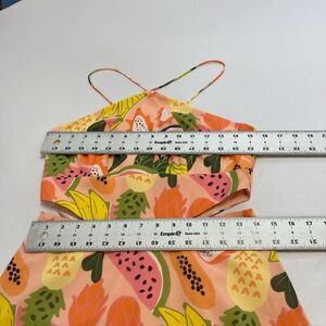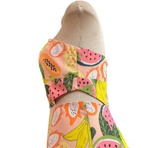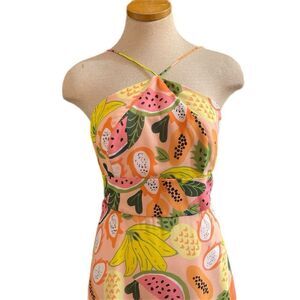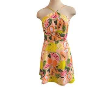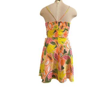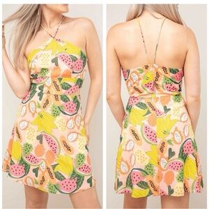 Vibrant mini dress with tropical fruit print. Features a halter neckline. Perfect for summer outings.