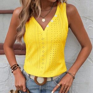 Brighten your wardrobe with this vibrant yellow sleeveless eyelet top. Perfect for sunny days and casual outings.