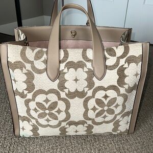 This elegant Kate Spade tote showcases a sophisticated geometric floral pattern in cream and brown, offering a modern twist on a classic design. With its structured sides and spacious interior, it's perfect for everyday use, combining style and practicality effortlessly.