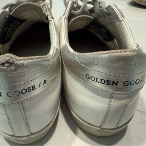 Golden Goose sneakers in white with a lime star accent. Trendy and versatile.