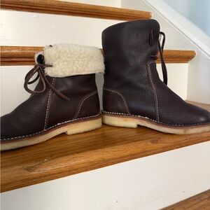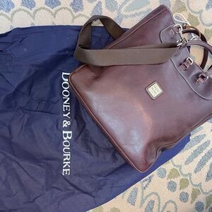 Beautiful Dooney & Bourke all leather tote. Crafted in rich brown leather with fabric cross body strap that can be removed. Great work bag. Lined in red fabric. In excellent condition, clean interior with key strap. Comes with dust bag.