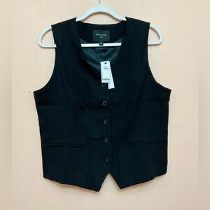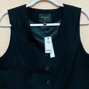New with tags Banana Republic Factory Hayden Vest. ⭐️Color: Black ⭐️V-neck ⭐️Sleeveless ⭐️Button front closure ⭐️Welt front pockets ⭐️Buckle adjustment at back ⭐️Fully lined ⭐️Fitted ⭐️63% recycled polyester, 34% rayon, 3% elastane spandex ⭐️Imported ⭐️Approximate measurements for size Large: -Pit to pit 20 1/2” -Waist 19 1/4” -Length from back of the vest 19 1/2”.