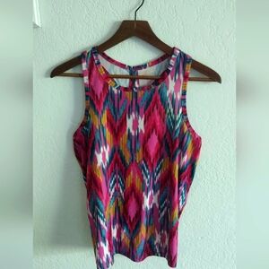 Beige cap with mesh back. Blue Topo Designs patch on front.