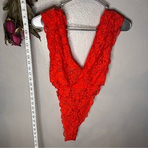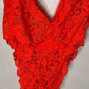 Selling a super sexy bright red bodysuit from We Are HAH! Made of recycled lace, it's adjustable at the waist & fit ms medium and those on the fence sizing down.
