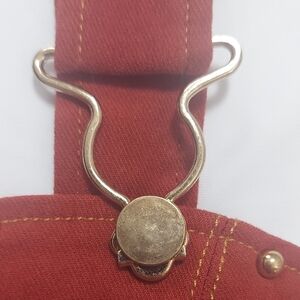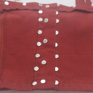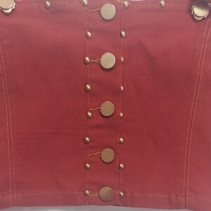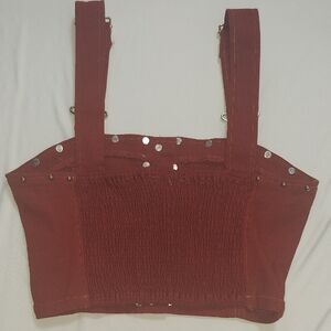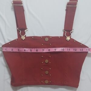 This striking crop top from Dance & Marvel features a bold red hue with eye-catching gold embellishments. Designed with a sleeveless, bustier style, it offers a structured fit and a straight neckline for a modern, edgy look.
