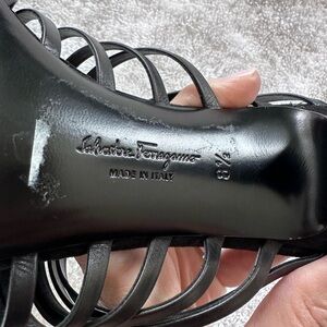 Ferragamo Mules-black knotted strappy leather upper with suede heels. Modern sleek look. Women’s 8-1/2. Worn once!