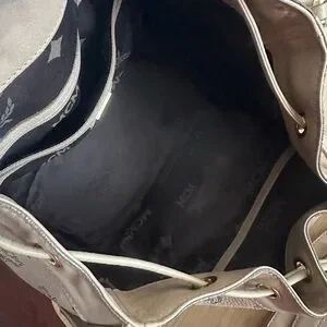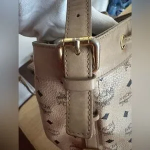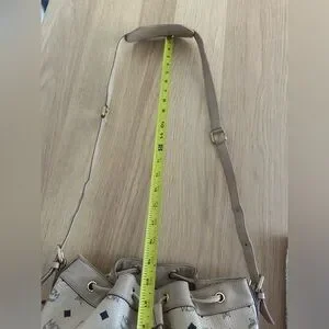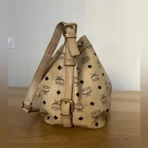 This MCM crossbody bag in a sophisticated cream hue showcases the brand's iconic logo pattern, offering a blend of luxury and practicality. Designed with a slouchy bucket silhouette, it features a drawstring closure and an adjustable strap for versatile wear. Perfect for those who appreciate both style and functionality in their accessories.