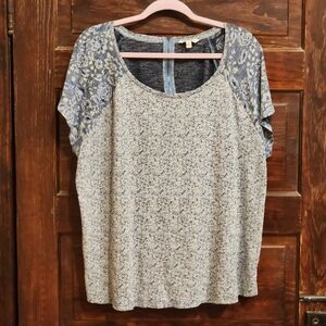 Vibrant blouse with an abstract pattern. Features shades of orange, pink, peach, and gray. Perfect for adding a pop of color to any outfit.