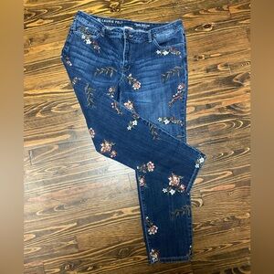 Medium blue wash with some deliberate fading. All over embroidery on front and back. Colors in embroidery are olive green, white, dark red. Inseam is approx 26 inches. Slim leg opening measures approx 6 inches. More relaxed fit. Waist measures approx 18.5 inches straight across and rose measures approx 10 inches.