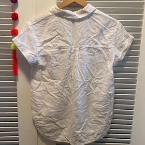 Classic white short sleeve button-up shirt. Perfect for casual or formal occasions—Size small—great condition—55% linen, 45% rayon—pet/smoke-free home—small smudge near bottom right (see last pic)