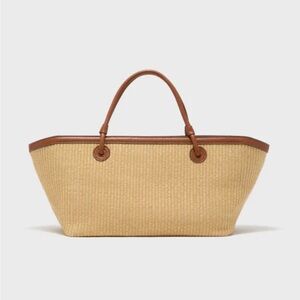 This Tuckernuck tote bag combines a natural woven texture with rich brown leather accents, offering a stylish and versatile accessory for everyday use. Its structured rectangular shape and spacious interior make it perfect for carrying essentials, whether you're heading to the beach or running errands. The elegant blend of tan and brown colors adds a touch of sophistication to its casual design.