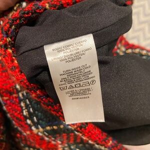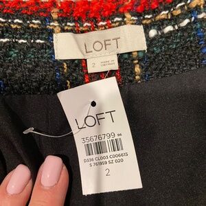 Brand new with tags, this LOFT red plaid tweed mini skirt in size 2 features a timeless black base with red, white, blue, and gold interwoven threads, creating a classic plaid pattern. Fully lined for comfort, the skirt is made from 100% polyester (both shell and lining) and has a flattering mini length of 18 inches with a 28-inch waist. Finished with a zipper closure, this chic skirt is perfect for dressing up with tights and boots or pairing with a cozy sweater for a stylish, polished look.
