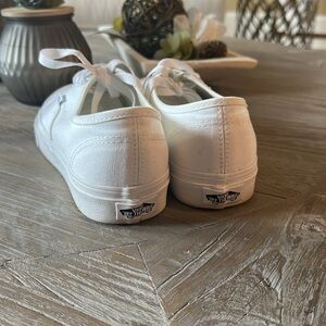 All-white Vans sneakers, featuring a minimalist canvas upper and the iconic waffle tread pattern for superior grip. The monochromatic design ensures versatility, making them a perfect match for any casual ensemble.