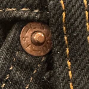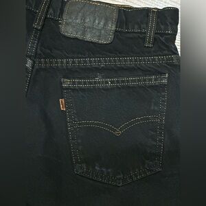 Vintage Levi's 550 Orange Tab Black with Paint Distressing Cutoff Jean Shorts. Frayed edge. Black label and orange stitching. In very good condition. No care tag. Factory made 513 stamp = USA