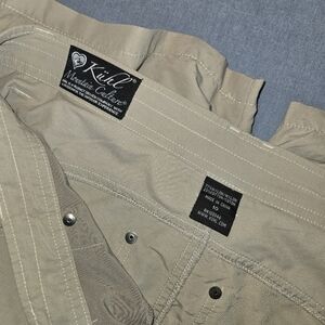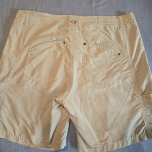 Kuhl women's size 10 shorts in khaki. Approximately 34-in waist, 7 inch inseam, and 10 inch rise. Two front pockets, two back pockets, and pockets on each side at the lower leg. Closes with a snap and zipper, 77% nylon and 23% cotton. Accented with Kuhl studs at the pocket corners. Please note that there is one teeny tiny spot on the side, which you can see in one of the photos. Otherwise, previously owned and in very good condition.