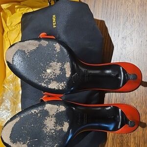 Elevate your style with these striking red heels from Fendi, designed to make a statement. Crafted with precision, these shoes combine elegance and comfort, perfect for any sophisticated occasion. Comes with heel caps and shoe bag in original box.